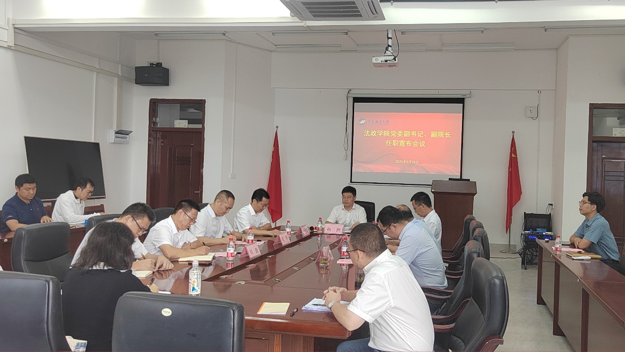 在湖光校区文科楼405室召开了党委副书记、副院长任职宣布大会。学校党委书记杨洲、党委组织部部长曾庆新出席会议,学院班子成员、中层干部、各党支部书记、辅导员等参加了会议。会议由学院党委书记林忠新主持。