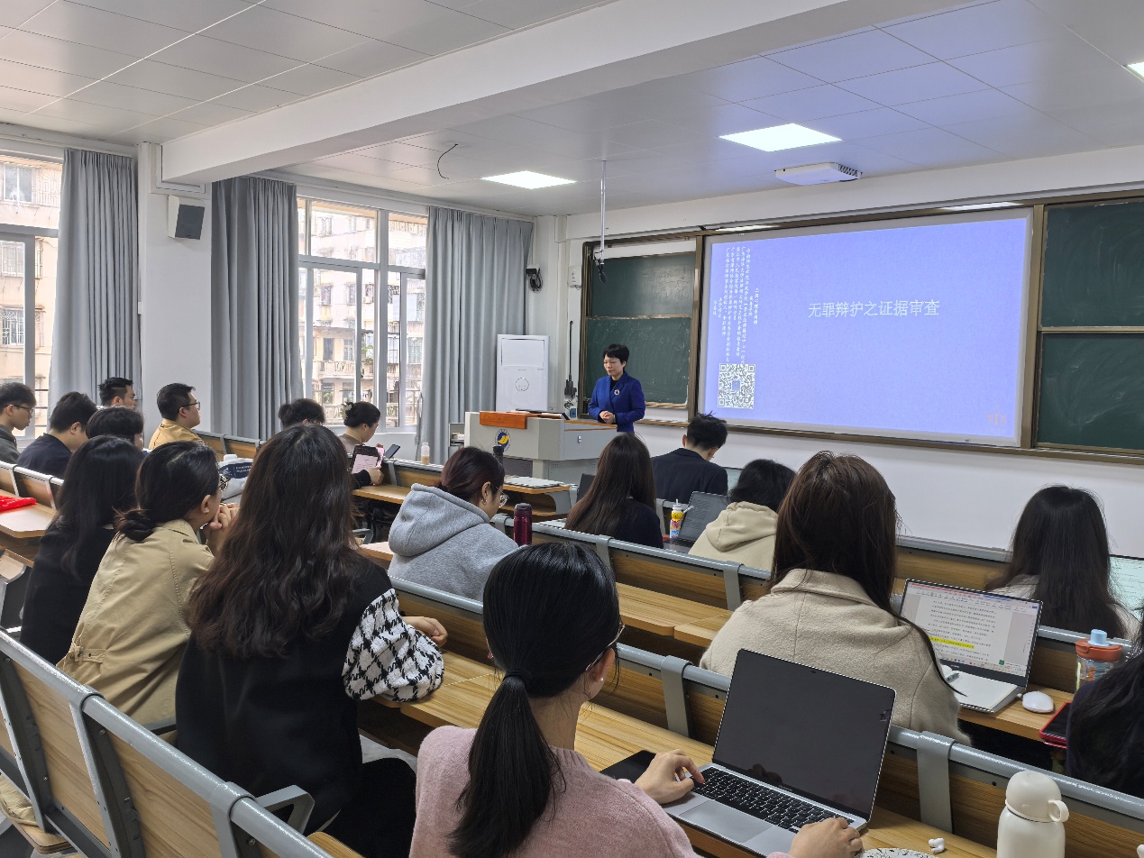 苏春妹律师以一宗涉嫌故意伤害罪、一宗涉嫌职务侵占罪案件为例,从无罪辩护的策略选择、证人证言的审查、办案流程的时间轴、无罪辩护的逻辑轴等方面做了详细的阐述,并且强调了无罪辩护办案全局观的重要性,最后专门介绍了言词证据的审查尤其是真实性审查的六大方法。讲座中互动积极热烈,气氛活跃,学生们纷纷表示有很大的收获。