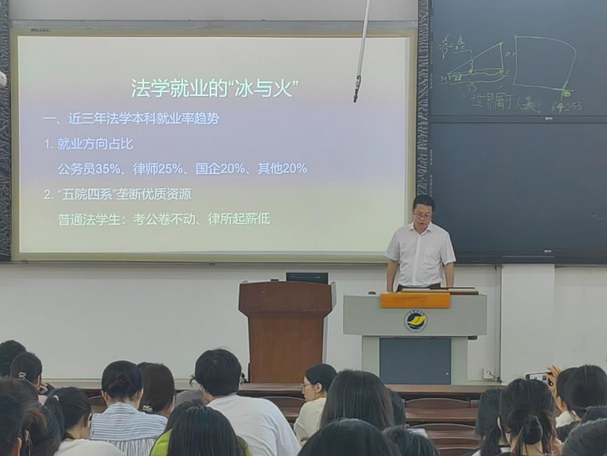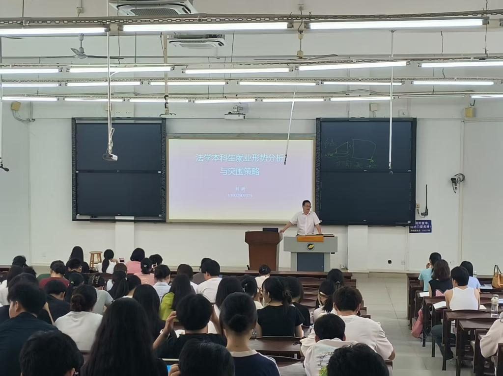 副院长刘澍教授担任主讲人,并作了以“法学本科生就业形势分析与突围策略”为题的专题讲话,2022级法学专业学生约270多人参加。