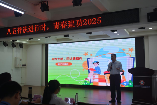 授旗仪式结束后,青年普法志愿者代表上台发言,表示将不断提升自身法律素养和业务能力,以便更好地服务群众、维护社会和谐稳定。随后,北京市盈科(湛江)律师事务所监事会主任黎红华律师深入浅出地讲解了民法典中与群众生活息息相关的法律条款,其中涉及继承权、居住权、民间借贷、个人信息保护以及高空抛物等内容。
