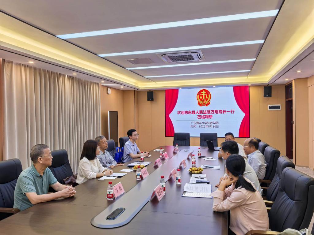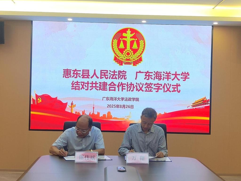 2025年8月26日上午,惠东县人民法院与广东海洋大学签订结对共建合作协议。签订仪式在广东海洋大学文科楼1栋612举行。惠东县人民法院万翔院长、李丽丽副院长、综合办吴镇泽主任、政治部马塨副主任、黄聪一级科员,以及耽美小说