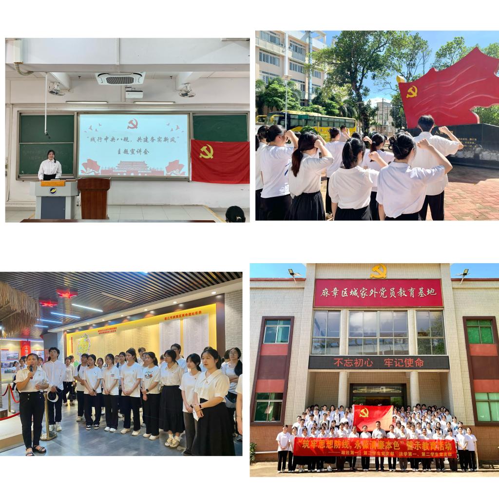 深耕社会实践,贡献服务地方“青春智慧”。支部充分发挥学科优势,组织党员深入基层开展系列实践。赴赤坎博物馆、老街开展红色调研,形成的专题报告为地方文旅发展提供决策参考;联合社工站进社区,为新业态劳动者群体精准普及医保政策,服务民生需求;远赴徐闻县设立“双百行动”法律服务点并开展法治讲座,将优质法治资源送达乡村,助力基层治理与乡村振兴;在金沙湾湿地公园开展净滩与游客调研活动,以专业方法服务生态文明建设。