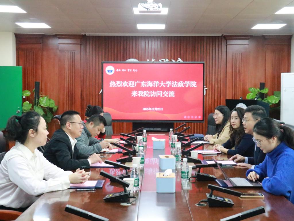 副院长刘澍教授带队赴广州开展调研交流活动。上午,调研团队一行来到广东工业大学法学院,受到李志明副院长等的热情接待。双方在会议室举行座谈,围绕科研管理、研究生培养、学科建设及学生就业等议题深入交流,并就海洋特色法学与工科院校法学教育融合发展的路径展开探讨。会上,双方表达了在科研合作、师资互访与学生互动等方面加强协作的意愿,并提出建立常态化交流机制,推动省内法学院校协同发展。