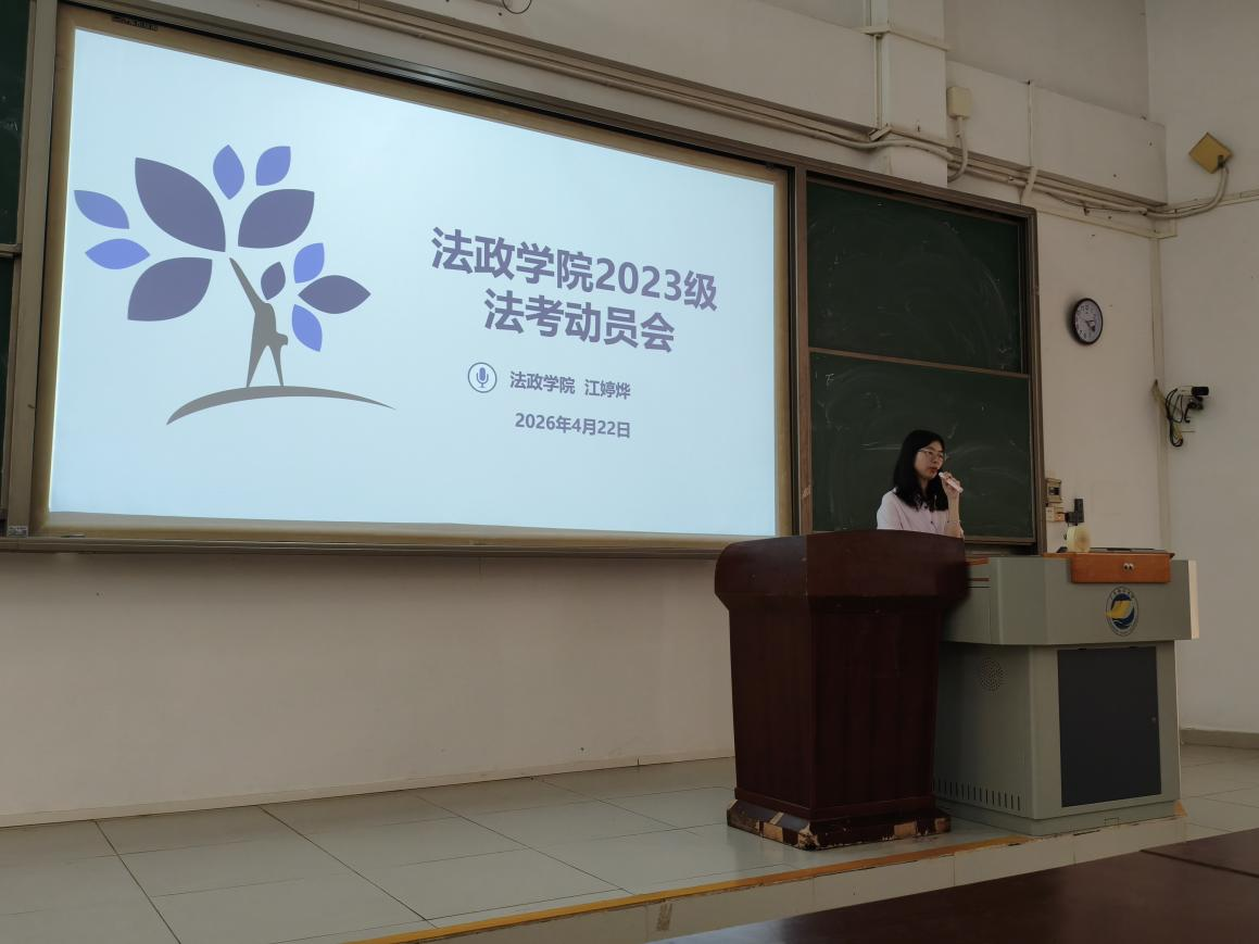 于2026年4月22日下午,召开2023级法学专业法考动员会暨法律实务技能卓越班开班大会。法律实务技能卓越班指导老师江婷烨博士、2023级法学专业辅导员邱日梅老师、2022级法学专业高分通过法考的蔡纯同学,以及2023级法学专业学生参加本次会议。
