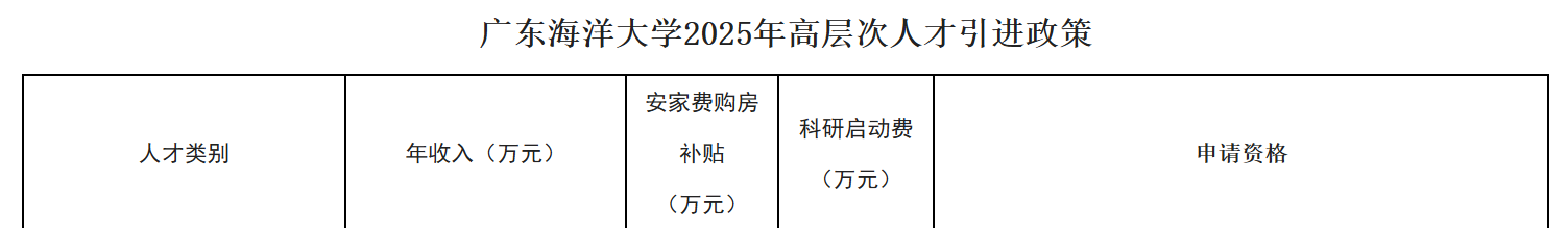 2.引进人才类别为C1、C2、C3等级的安家费、购房补贴、科研启动费等待遇将按广东海洋大学2026年高层次人才引进政策施行。广东海洋大学2025年高层次人才引进政策仅可作为参考。