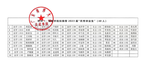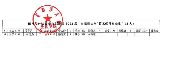 根据《广东海洋大学学生先进集体与先进个人评定办法》(校学生〔2019〕53号)、《关于评选2023届优秀毕业生及征集百名优秀毕业生风采展示材料的通知》(校学生〔2023〕20号)的文件精神,经学生本人申请、学院评审,拟推荐郭晨旭等48名同学评选“优秀毕业生”,拟推荐林雪花等8名同学材料报送“广东海洋大学2023届百名优秀毕业生风采展示”(见附件1、附件2),现予以公示。