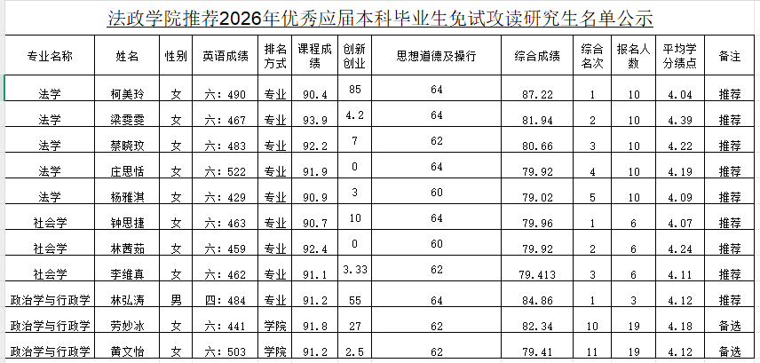 推荐优秀应届本科毕业生免试攻读研究生实施细则》,学院组织了推荐优秀应届本科毕业生免试攻读研究生遴选工作。经本人申报,学院遴选工作小组审核评定后公示。根据综合成绩名次排序,拟向学校推荐柯美玲等9名学生免试攻读研究生。现对答辩结果和推荐情况予以公示。