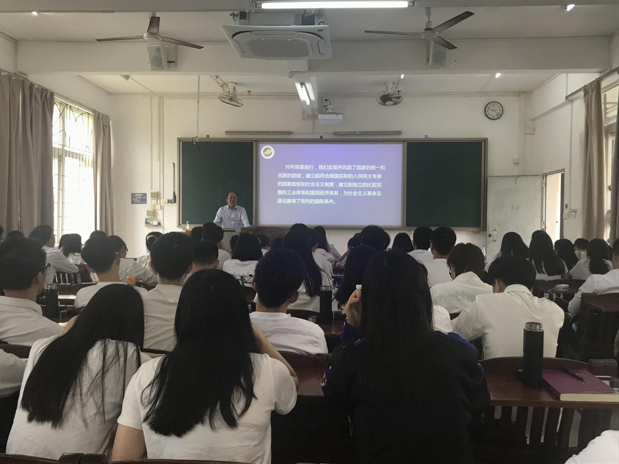 陈伟斌以“新中国主要发展历程、成就与启示”为主题,带领同学们回顾了新中国发展历程,特别提到了“抗美援朝精神”与“两弹一星精神”,要求同学们传承与发扬革命先辈“英勇顽强、舍生忘死”与“舍小家,为大家”的精神。在讲述新中国发展取得的伟大成就的时候,陈伟斌从经济总量、居民收入、科技实力、国防建设等12个方面展示了祖国发生的翻天覆地的变化。最后,他从坚持中国特色社会主义制度、坚持中国共产党领导、坚持改革开放、始终代表人民群众四个方面总结了新中国发展的经验启示,并向同学们勾画了中国未来的美好图景。