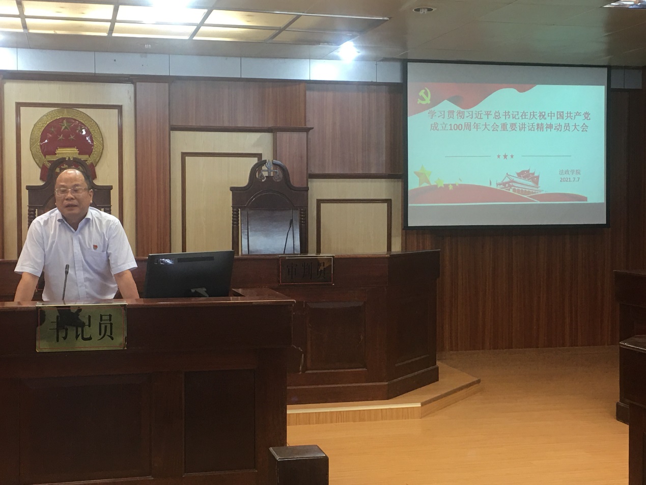 7月7日下午,耽美小说 党委在湖光校区教学主楼模拟法庭召开了学习贯彻习近平总书记在庆祝中国共产党成立100周年大会上重要讲话精神教师、干部动员大会。会议由张显伟院长主持、陈伟斌书记作动员讲话,耽美小说 全体教师、干部参加了会议。