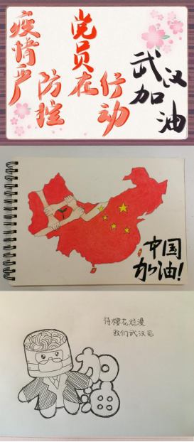 隔地不隔爱,以多样方式给予防疫祝福。在“宣传防疫战疫,展现党员风采”主题抗疫宣传活动中,同学们以手写祝福或拍摄视频的方式为抗疫加油。植韵鸿同学通过歌声唱出“明天会更好”的期待,传达防疫必胜的坚定信心。温绮同学画出以五星红旗为底图背景的中国地图,地图上突出展示的是五湖四海的人们紧握的双手,展现了全国人民齐心协力抗击疫情的团结力量。梁淑莹同学则以漫画的形式为武汉加油,通过描绘戴着口罩的热干面的卡通形象,表达了“待樱花烂漫,我们武汉见”的美好憧憬。