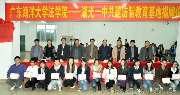 12月5日,法学院与湖光一中携手合作在湖光一中签订教育合作协议并举行“共建法制教育基地”揭牌仪式。校党委委员、规划与法规处处长谭树明、副处长吴汉华,法学院院长栗克元、党委副书记周荣伟,麻章区关工委主任余堪培、教育局局长彭镇强、司法局副局长郑章成等出席了会议。栗克元、彭镇强先后作了讲话。