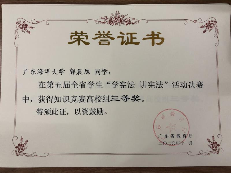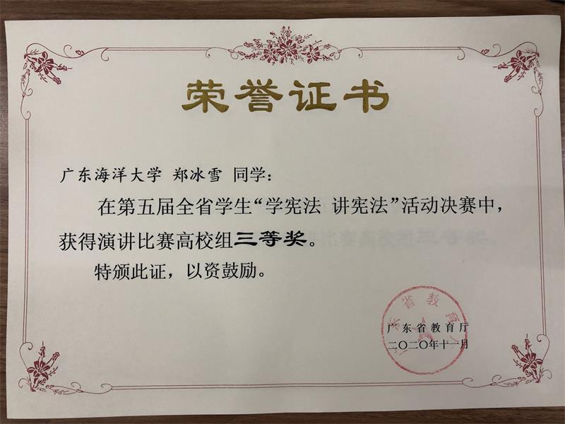 近日,我校耽美小说 法学专业18级1186班郑冰雪同学、19级1191班郭晨旭同学在今年省教育厅举办的全省学生“学宪法讲宪法”活动决赛中,分别获得演讲比赛高校组三等奖、知识竞赛高校组三等奖。